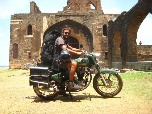 La motocicletta, una Royal Enfield modello 1990 é costruita con lo stesso disegno originale del ’45. É ruvida, con una coppia piatta, quasi fosse un diesel, 350cc raffreddata ad aria, pesante, goffa, ma allo stesso tempo una vera signora della strada, ovunque trova rispetto ed ammirazione e qualcuno ti dà pure precedenza. La strada é lunga, il contachilometri rotto si é bloccato a 999Km, ma la distanza che percorro é ben superiore ai 10.000. Quello che si vede, sente, respira lungo il tragitto é indescrivibile. Bisogna re-imparare a guidare, su questo lungo campo di battaglia, dove vige sovrana l’anarchia. Non sono solo parole é roba seria! Quando compro la moto, ho 2 tizi ai lati uno a destra uno a sinistra. L’angelo ed il diavolo che mi parlano a turno: Se ti ferma la polizia, nega tutto, non sorpassare sui ponti, attento ai cani, ed allo sterco di mucca che scivola come l’olio, fermati ogni 2 ore a raffreddare il motore. Quando finalmente parto sono confuso e mi perdo nei miei pensieri accompagnato dal rumore di sottofondo del motore. Verso mezzogiorno fa caldissimo, la crema protezione 50 serve un po’, ma poi, quando sei lì fermo all’incrocio senza vento, sudato ed impolverato, circondato da camion che ti coprono di smog l’inferno non é poi così lontano.