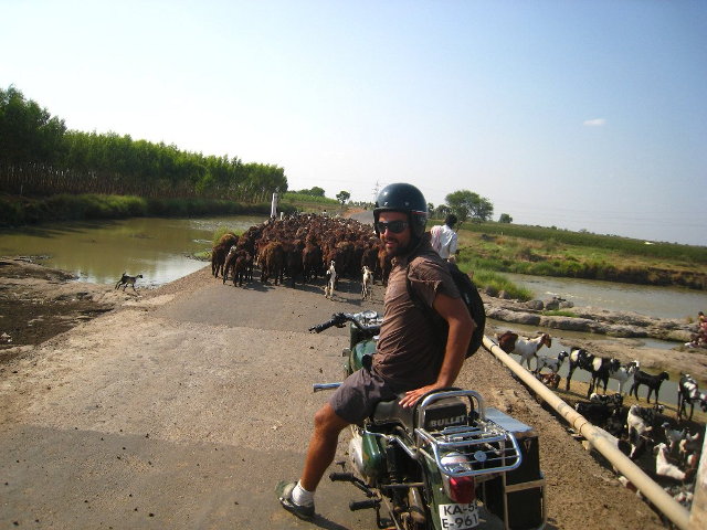 Direzione e verso sono roba da libri di fisica, la precedenza é un’opinione, stop e frecce costosi optional. Ecco un siparietto, che con cambiamenti casuali, mi si ripropone diverse volte al giorno: strada a 4 corsie (2 per verso), io procedo su quella lenta mentre un carro trainato da 2 buoi procede su quella di sorpasso contromano! Arrivo sulla strada normale a 2 corsie, curva a destra e mi trovo davanti un autobus, contromano, che sta sorpassando un camion già in sorpasso su di un taxi, mentre una vacca caga sulla riga di mezzeria. Il finale? Piú o meno é sempre lo stesso: mi butto in corsa sul ciglio della strada, il camion schiva la mucca a sinistra, l’autobus a destra mentre il taxi finisce con 2 ruote fuori strada, si ferma e riparte come nulla fosse. Poi ci sono le mandrie di animali, mucche, bufali, capre attraversano sempre nei punti più imprevisti, se ci finisci in mezzo son fatti tuoi! Chi attraversa la strada a piedi, o arriva da una strada laterale con un qualsivoglia veicolo, rigorosamente non guarda! Apparentemente é responsabilità di chi sopraggiunge schivare, come possibile, l’ostacolo. In paese é anche fattibile, ma in autostrada vedersi una moto con 3 tizi a bordo che parte dal campo ed atterra direttamente sulla corsia di sorpasso a 10Km l’ora, é roba da infarto.